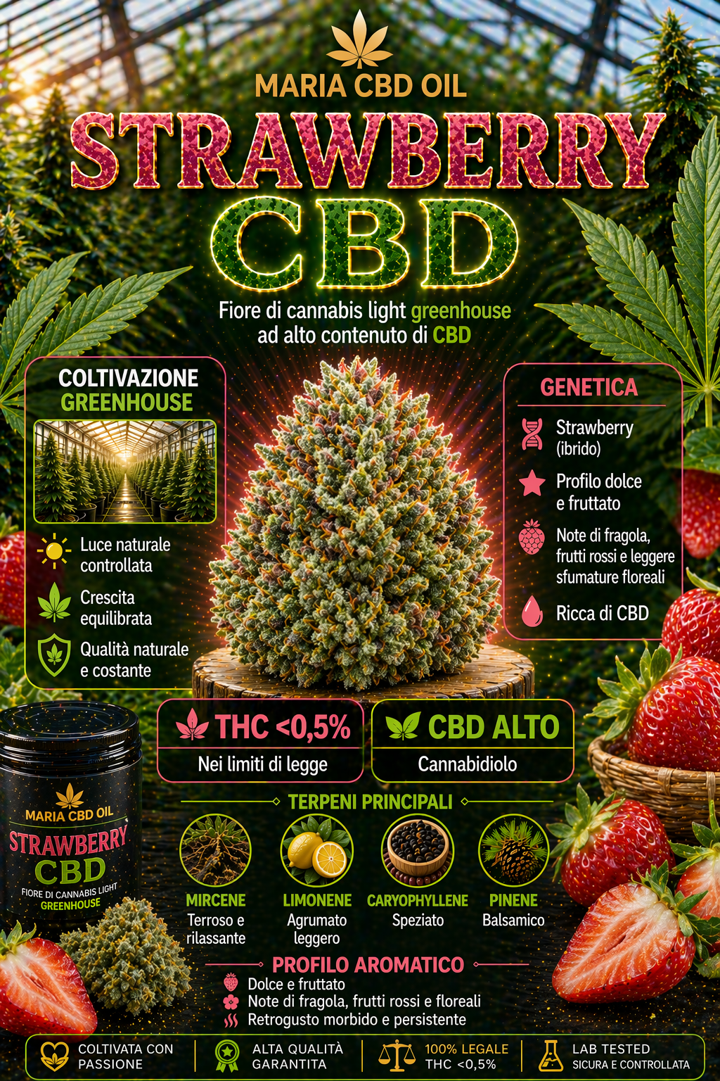 Buona potenza, profilo terpenico interessante. Stimola una sensazione di benessere.
